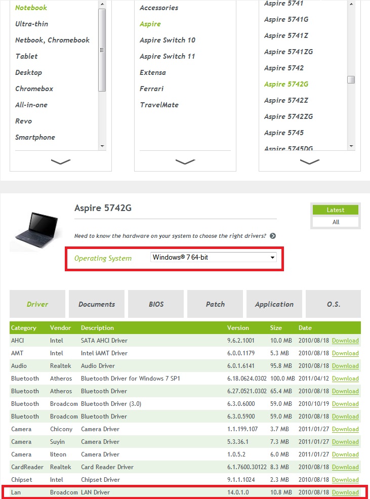 Proklikáš se tím tak, že v prvním sloupci zvolíš notebook, ve druhém "Aspire", ve třetím "Aspire 5742G". Pod těmi třemi okny zvolíš systím (Win7 32/64 bit).