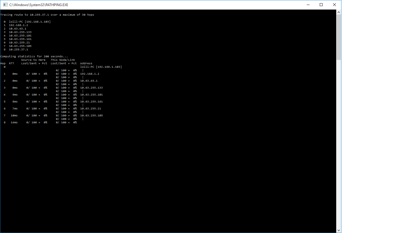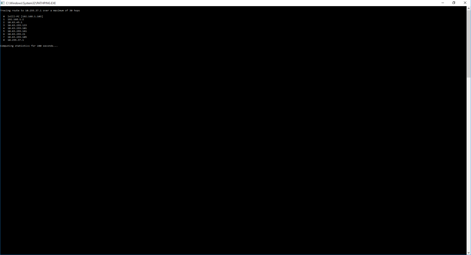 Ok, takže napiš příkaz pathping 10.255.37.1 a pak prosím počkej nejméně 5 minut na výsledek. Okno příkazového řádku můžeš ve vertikáním směru zvětšit, aby byl výsledek vidět celý.