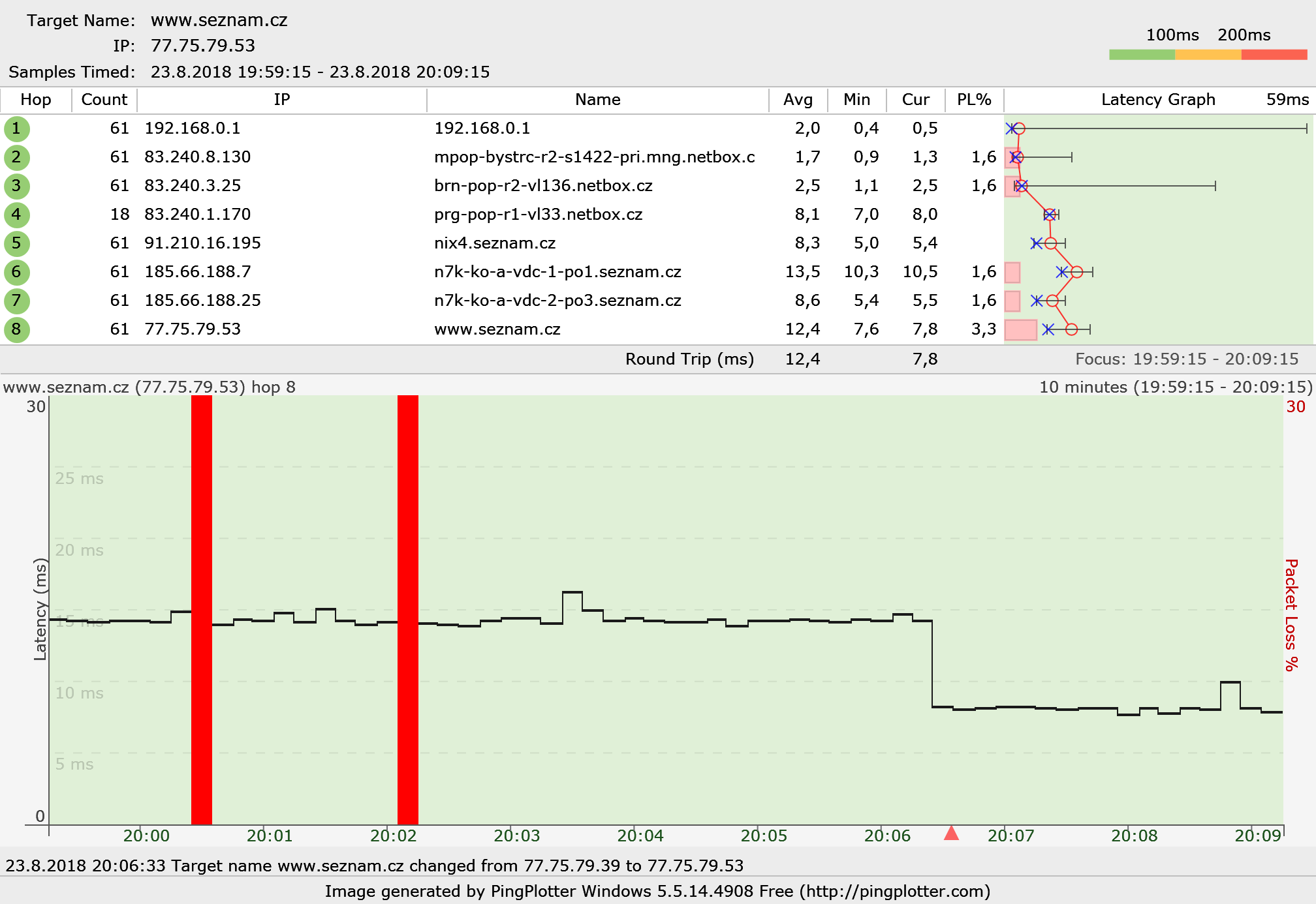Poslední dobou jsem zkoušel mít zapnutý PingPlotter (ping na seznam.cz) a nepodařilo se mi ani při výpadku nic zachytit, dneska jsem měl štěstí: