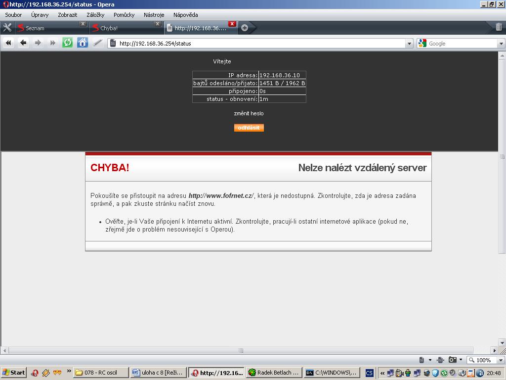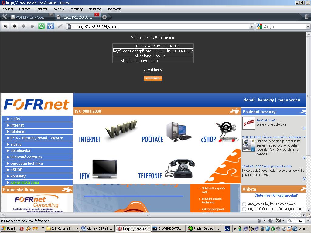 Ahoj, mám takovej docela divnej problém. Mám domácí síť a internet do ní de z routeru Zcomax WA-2204A-TX (firmware v1.4.6.P). A čím dál častějš se mě stává, že prostě najednou přestane internet fungovat, respektive spuštěná Miranda zůstane připojená, můžu normálně komunikovat po ICQ, Jabberu.., no a když chcu jít v prohlížeču na internet tak jediný co se mě načte je přihlašovací stránka od providera, všechny ostatní stránky házijou chybu. Jenže jakmile router restartuju tak najednou to zas všechno funguje... Dělalo to už dřív, tak sem myslel že to vyřeší novej firmware, tak nejdřív sem tam nahrál 1.4.6.I, a teď tam mám 1.4.6.P, ale ani jeden to nevyřešil... Nechápu to, může mě někdo poradit? Do přílohy dávám screen jak to vypadá, to je přihlašovací stránka mojeho providera, kde má v iframu (nebo něčim takovým) vloženou svou homepage. První je když to nefunguje, druhej je tak jak to má vypadat.