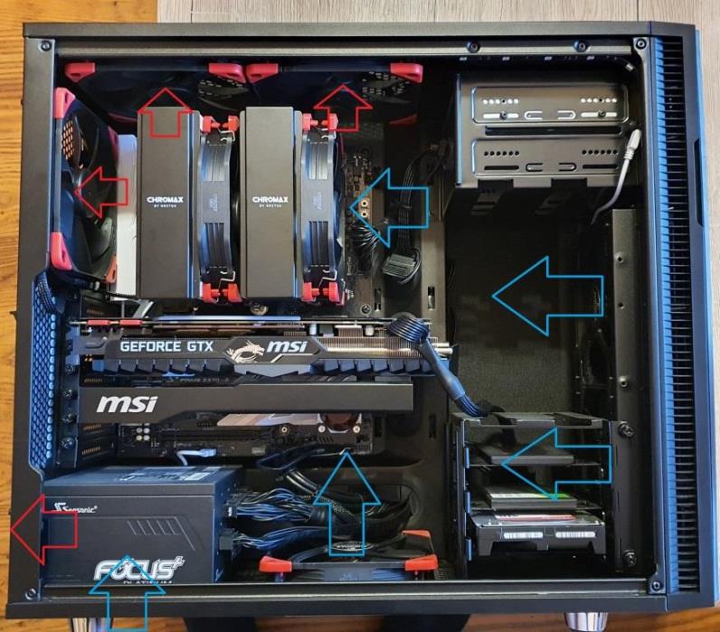 V tomto připadě zespod je ke kartě přiveden chladný vzduch, který ji obtéká a přebytečný teplý vzduch z bedny je odveden vrchníma ventilátorama navíc za pomoci i těch co jsou na radiátoru vodního chlazení.