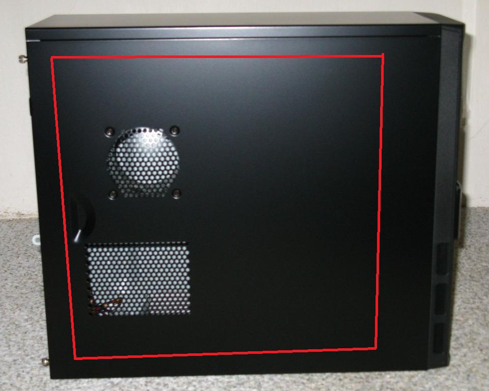 SPíše mi tak zajímá jedna věc. Pokud to říznu tak, jak jsem to vyznačil, bude pryč i úchop ke snažšímu oteření. Před ním to řezat zas nemůžu - díra k CPU sice by zmizela, ale kousek díry ke GPU by zůstal a to nechci. Tudíž bych řezal za úchopem. Jenže, a teď problém. Plexi z vnitřní strany přesáhne díru, jelikož nechci přidělávat tavným lepidlem budu přidělávat šroubama a teď právě nevím, zdali tam bude místo k nasazení bočnice od konce, jelikož se bočnice při nasazování musí alespoň 5 cm od oka zasunout odzádu, Aby tak mělo mezi zadní ohlou stranou na šrouby a plexim místo :(
