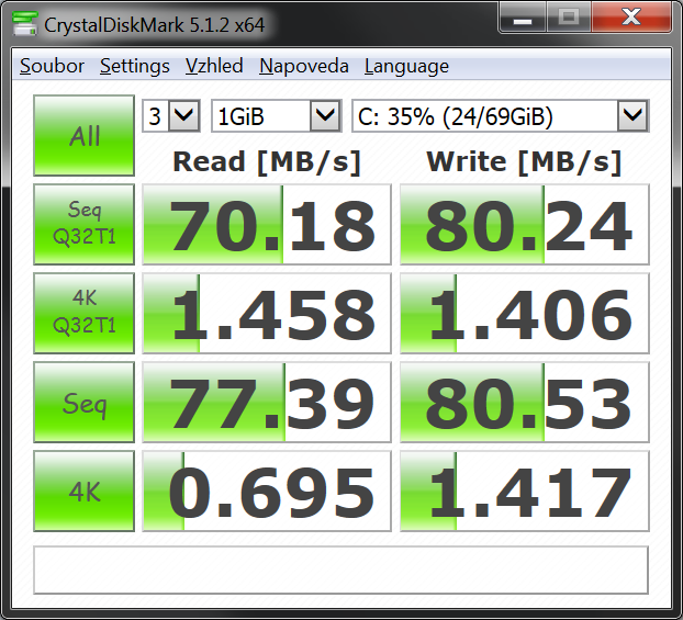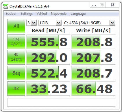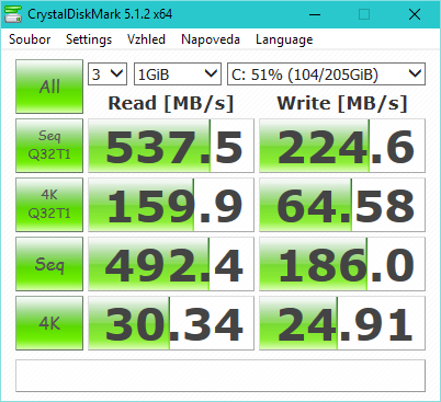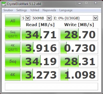 Je fakt, že ve srovnání s viewtopic.php?p=1353313#p1331639 nic moc... Rychlosti se lišit mohou, protože CDM ukazuje max dosaženou, a ta se může lišit dle toho, jak zrovna OS šahá na disk...