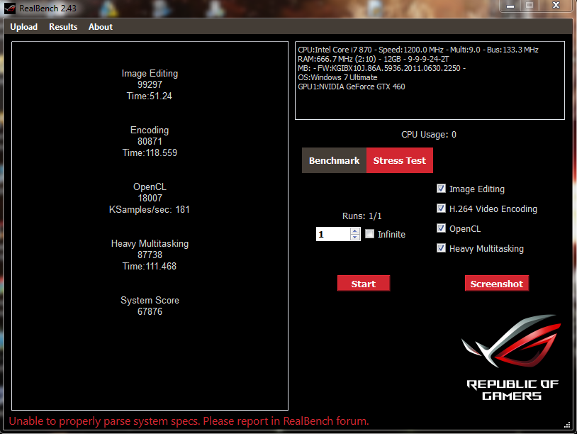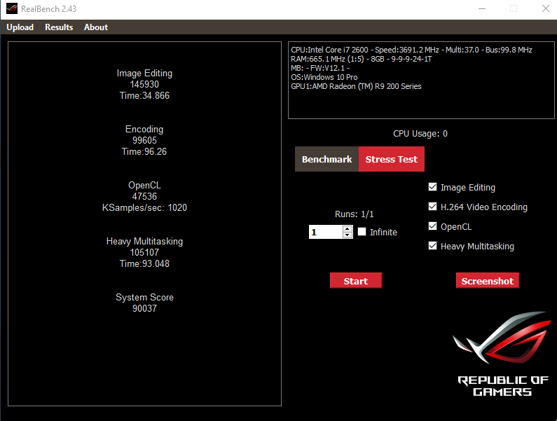 . OpenCL je grafika a jak je vidět, má tam víc bodů i lepší průběh (1135KSamples/s).Změřte výkon s ostatními - ROG Realbench