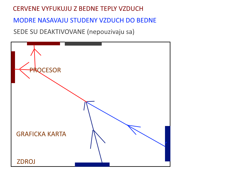 Studeny vzduch sa nasaje v predu a z dola, ohreje sa o graficku kartu a procesor a potom sa hore a vzadu vypusti teply.