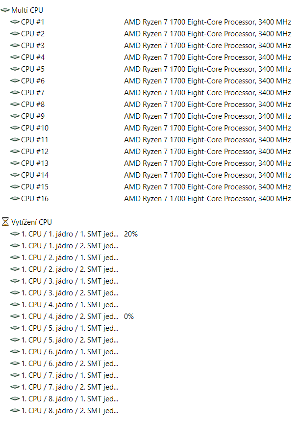 Ahoj, mám 8 jádrový Ryzen 7 1700. Včera jsem zkoušel přetaktovat procesor, upravil jsem volty a výši frekvence. Párkrát mi to spadlo, ale nakonec se mi podařilo pc stabilizovat. V biosu jsem upravoval i jiné položky.Druhý den(po restartu) mi pc začalo ukazovat jiný počet jader a to 16. Zvedla se mi teplota procesoru a to o cca 16 stupnů. Do jakéhokoliv programu(Aida atd.) se podívám všude vidím 16 fyzických jader! Počítač běží svižněji :). Prosím o radu co se vlastně s mým procesorem stalo?