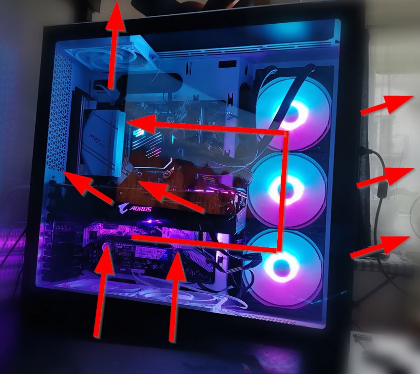 Chce to radiátor hodit úplně nahoru a dopředu tři ventilátory co budou tlačit vzduch dovnitř. Ty pod grafikou bych otočil aby foukaly ven pod skříň.