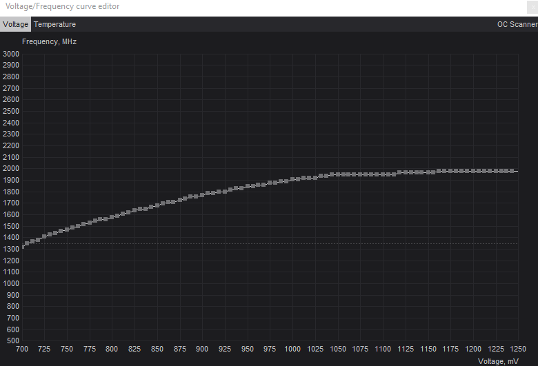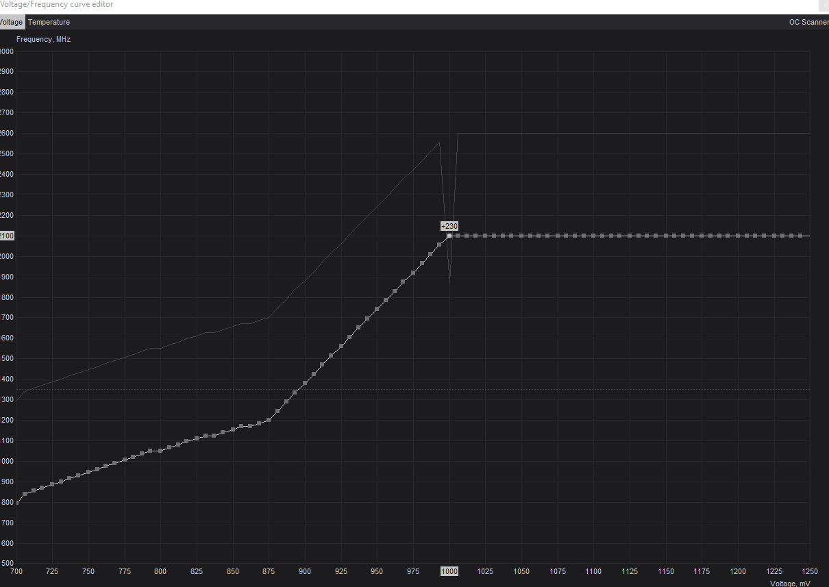 Chápu správně, že když mám křivku takto, tak to poběží na frekvenci 2100 při 1V? Jde mi to, že pak při benchmarku RDR2 to sice běží na 2100. teplota max 82, ale FPS o 10 nižší než pří původním OC bez hraní si s V. Takže jak to mám tedy udělat správně?