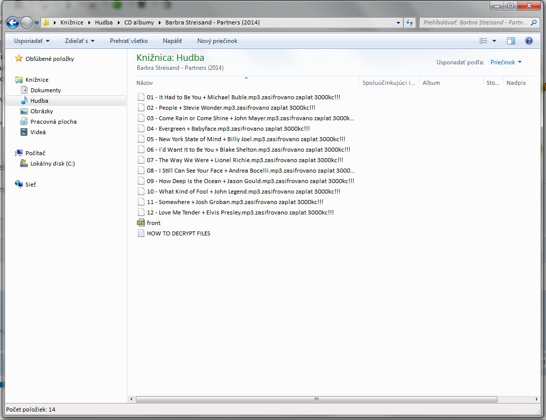 stala se mi taková věc, otevřu PC a tam se zobrazí hláška - soubor zašifrován, zaplať 3000 Kč, je to úplně u všech souborů, které jsem v PC uložila, varuje mě to, abych zaplatila, jinak po 14 dnech se mi soubory smažou. Nevíte, prosím, zda s tím jde něco udělat, abych o soubory nepřišla?
