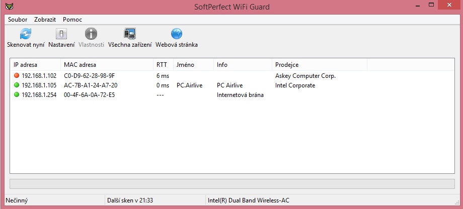 Pomocí jednoho programu jsem si provedl scan a našlo to tři adresy. Jedna by měla být router a zbylé dvě PC a TV.