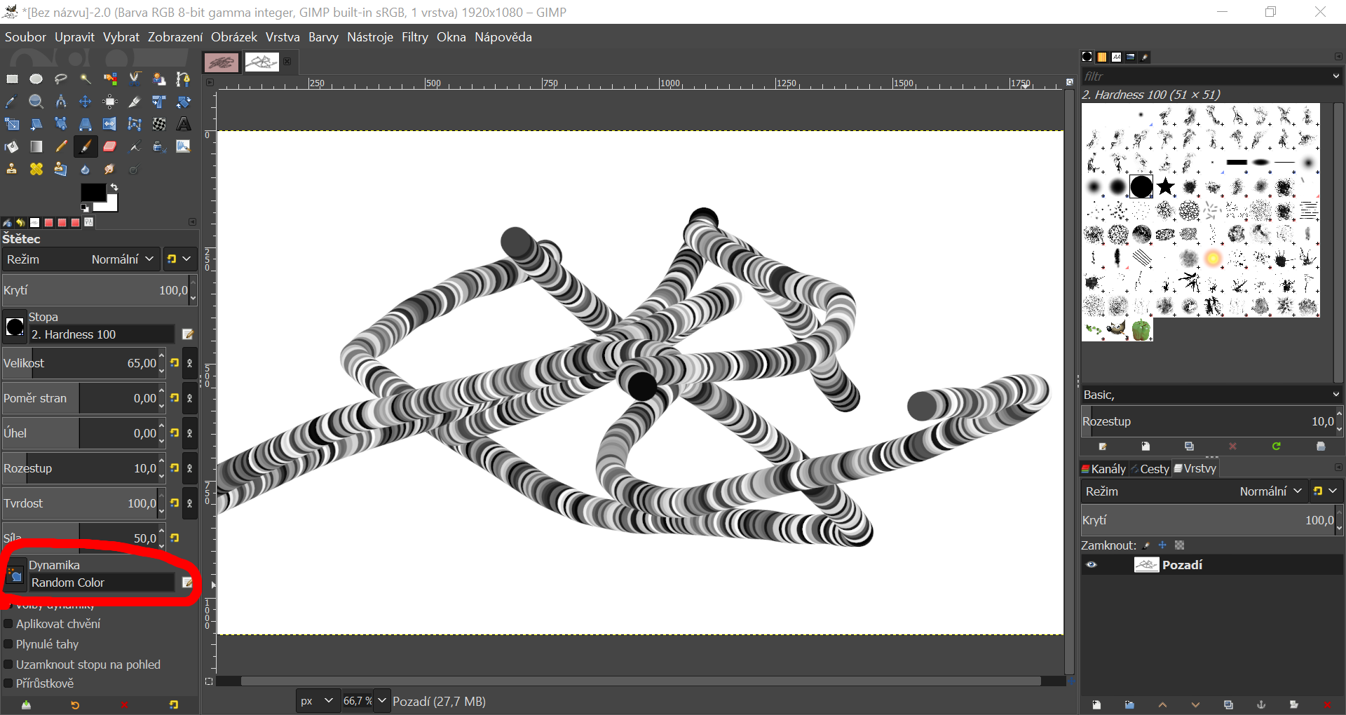 Když kreslím v programu gimp barva se mění mezi foreground a bckground jak je vidět na obrázku ,už nevím co s tím ani reinstall nepomohl. Používám základní brush a tool štětce. Chtěl bych aby to kreslilo jen foreground barvou jako vždy . předem díky za odpověd