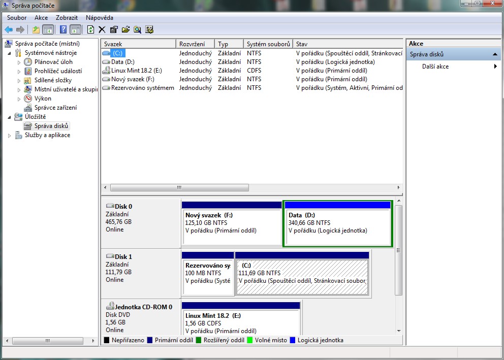 To bude asi neprůstřelný řešení. Jen jedna věc: Na D mám data, o který nechci přijít... Bude s tím problém, nebo se linux nainstaluje na odstraněný místo po "F"?
