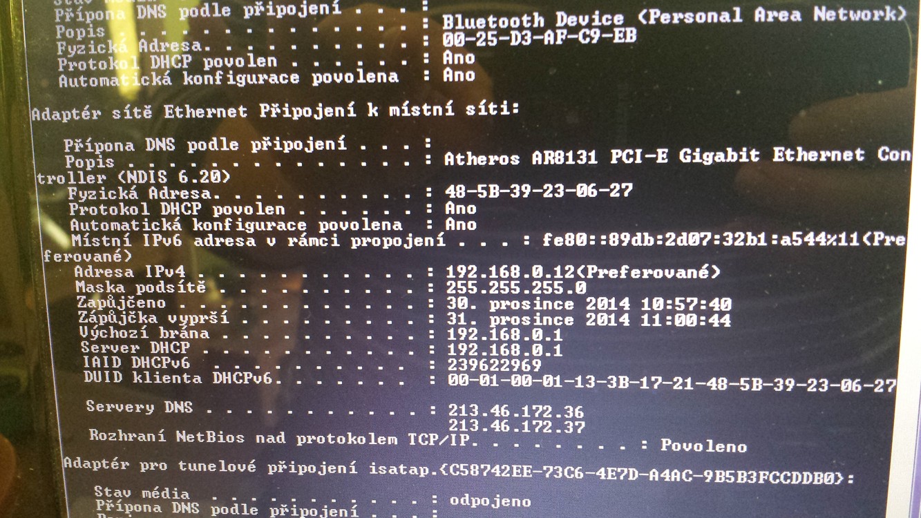 2.u pripojeni kabelem se chova stejne-prikladam screen vypisu ipconfig/all cast Ethernet Pripojeni k mistni siti