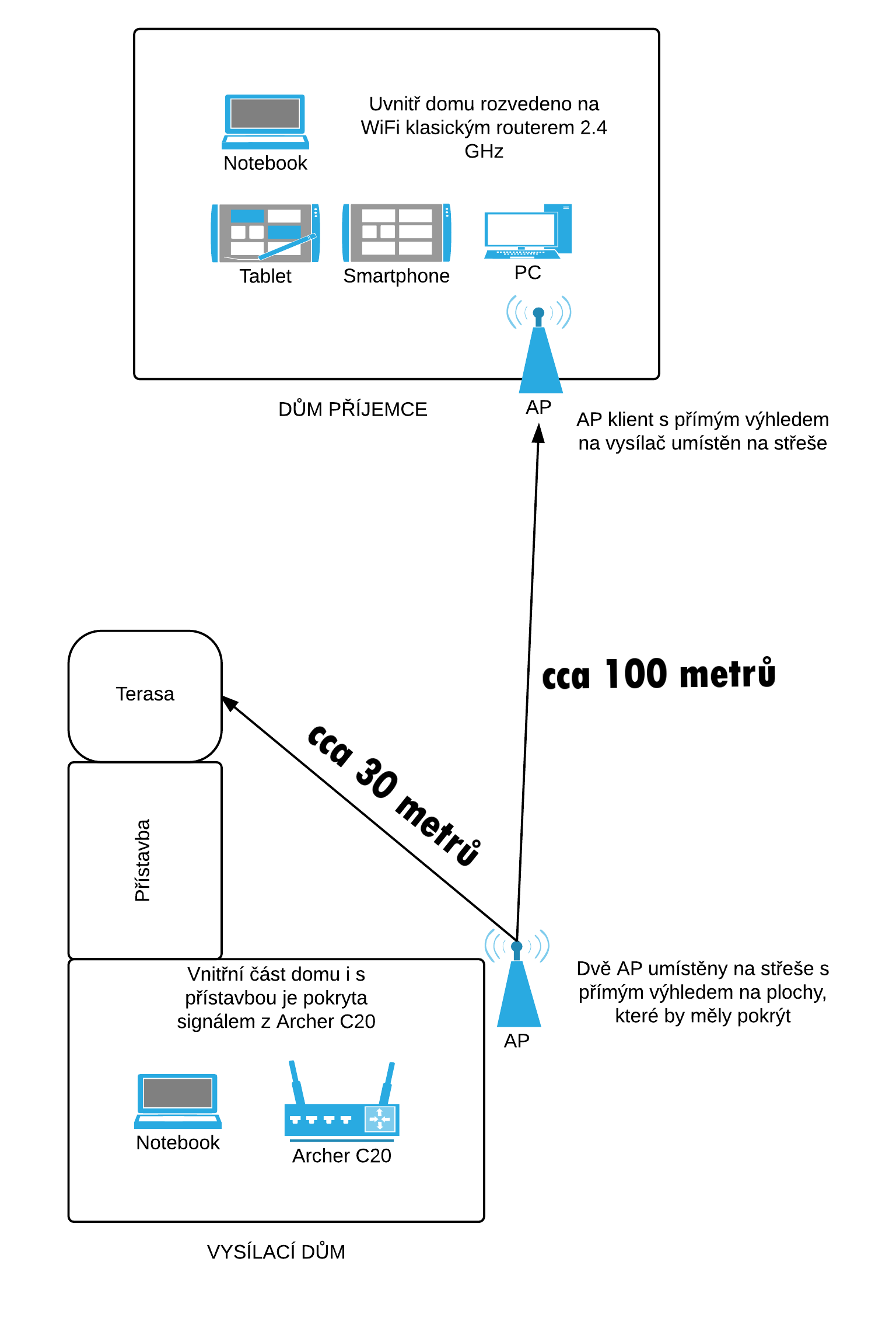 Mým plánem je napojit stávající router, který je v přízemí domu (Archer C20) na switch (nějaký 300Mbit/s) umístěný ve druhém patře pomocí kabelu, z tohoto switche by poté vedly dva další kabely zhruba 4 metry ke dvoumi PoE napájenými AP, které budou umístěny venku, jedno pro vysílání signálu WiFi na terasu vzdálenou od vysílače cca 25 metrů a druhý směrový AP (Ubiquiti NanoStation Loco M2), který by mířil na protější dům vzdálený od vysílače cca 100 metrů, kde by bylo taktéž AP Ubiquiti NanoStation Loco M2 ale jako klient.
