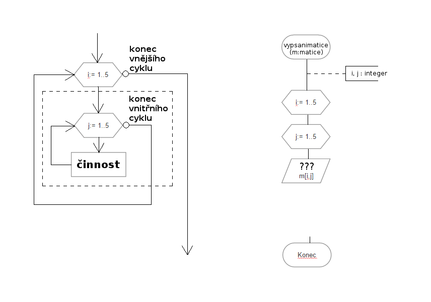 Bacha na to že vnitřek těch cyklů jsem vyřízl, a chybí tam to větvení! A ten čárkovaný obdélník tam také nepatří, ten tam byl jen abys lépe viděl blok vnitřního cyklu.