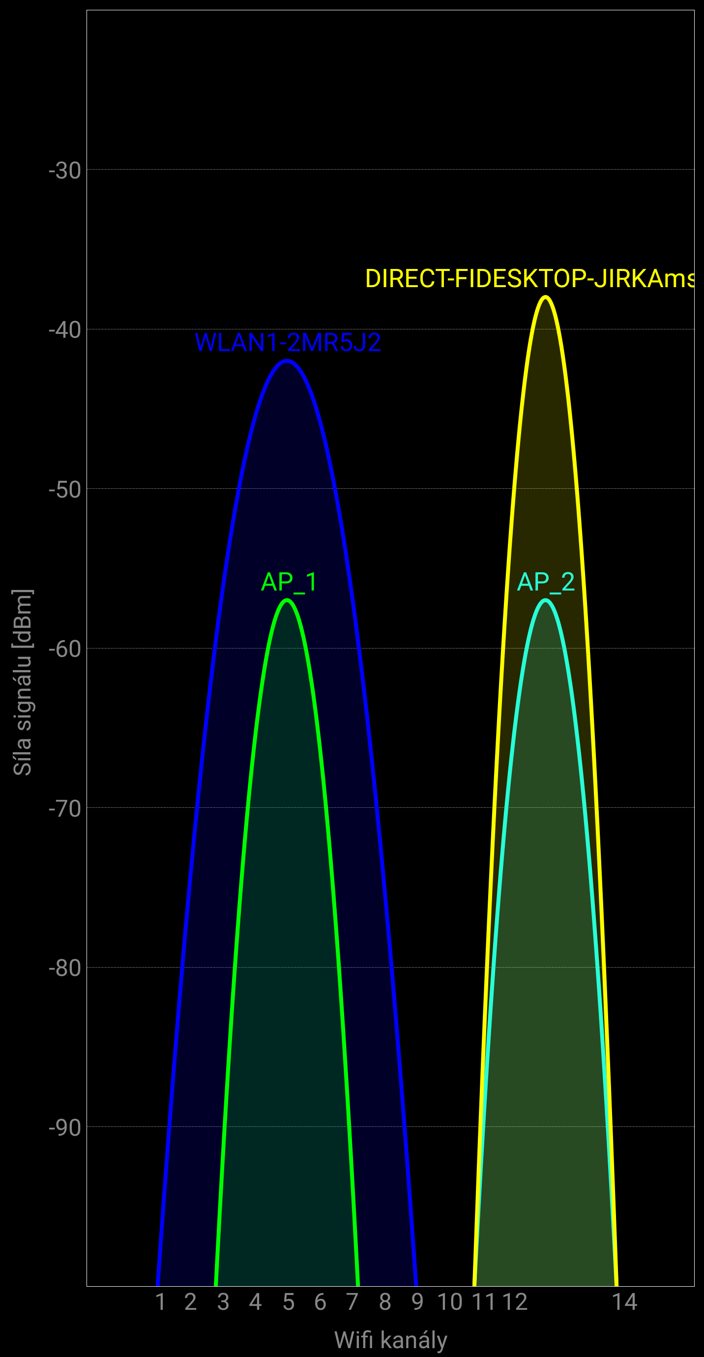 Skutečně jsem na samotě a ještě k tomu 380m od vysilače providera. AP - Huawey. 100 lidiček, klientů nevím. 20/40 MHz zkouším. Oni ty Ap (AP-1 a AP2) jsou power linky a mám je na druhé straně domu, takže je ve skutečnosti nevidím. Ale ten WiFi Direct fakt putuje a klidně si zaleze na kanál toho WLAN1. To je potom jedno zda 20 nebo 40MHz. Proto ten "truc" ! Nechci stále mít spuštěný WiFiAnalyzer a donekonečna a bezvýsledně laborovat.