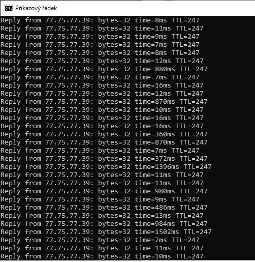 Teď k problému. Problémy začaly jako výpadky připojení, vždy na sekundu. Při měření pingu v CMD - .ping seznam.cz -t to vypadalo vždy následovně (příklad):