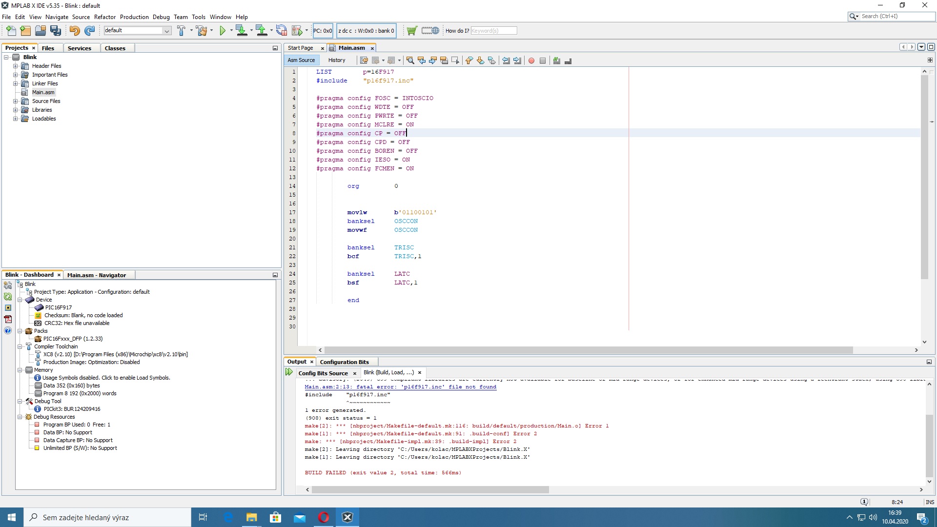 začínám se učit v Assembleru s kombinací programátoru PICKIT. Zatím zkouším nejjednodušší zapojení. Můžete mi prosím pomoc v čem mám chybu? Děkuji
