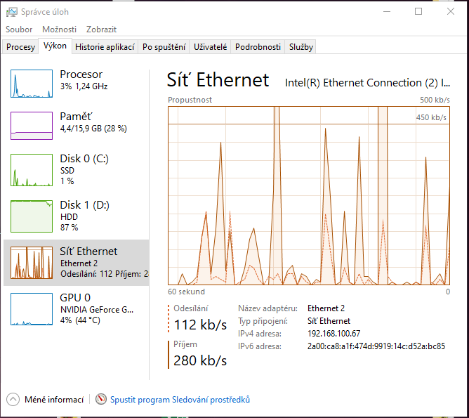 - zkontrolovat zatížení sítě (ctrl+shift+esc, správce úloh, rozšířené, výkon, síť.