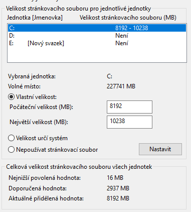Nastav strankovaci soubor na tvrdo na 1.5 nasobek velikosti RAM.