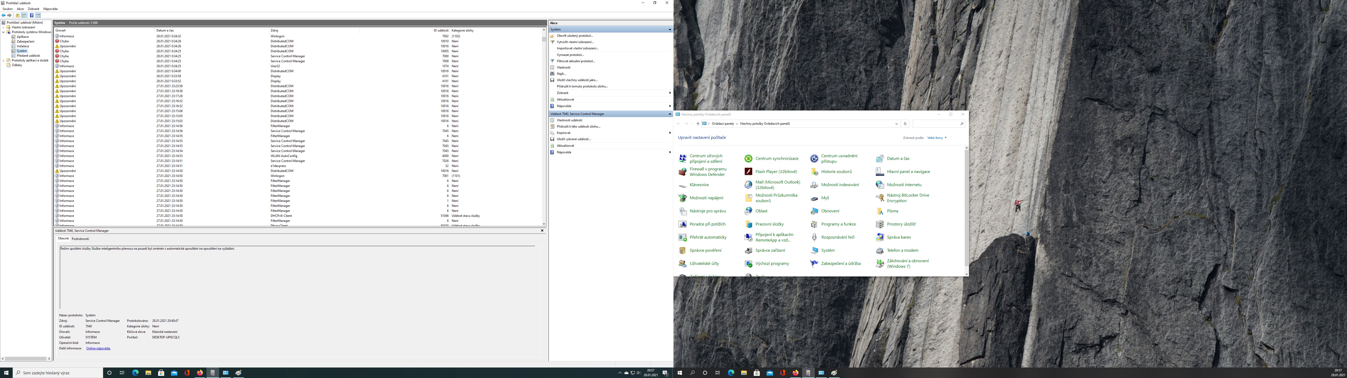 Tady jsou nějaké print screeny z prohlížeče událostí. Je tam spousta žlutých trojúhelníků a taky červených vykřičníků. Ty červené se týkají vždy "Service Control Manager" nebo "DistributedCom". Taky přidávám detaily. Všiml jsem si u těch print screenů, že pokračuje obrazovky ještě daleko vlevo a tam jsou ty okna co já nevidím?!?!? Přitom rozlišení mám nastavené správně.