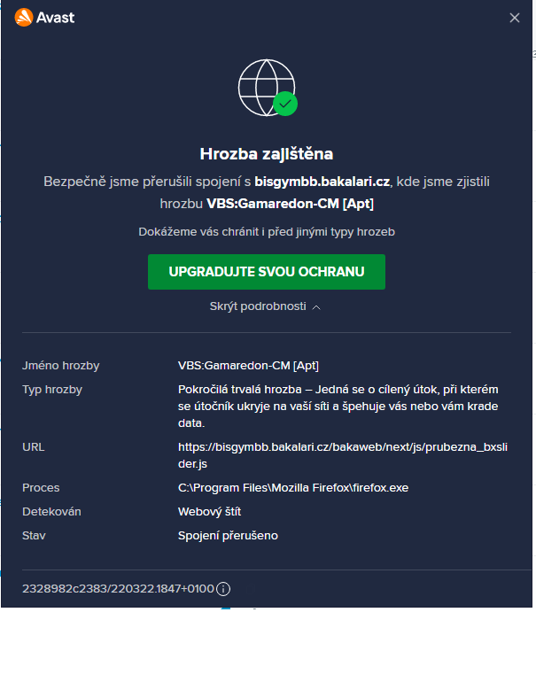 syn byl přihlášen v aplikaci Bakaláři a Avast detekoval následující hrozbu, viz screenshot. Pak se objevila ještě asi 2x. Projel jsem systém Avastem a nyní pouštím eset online scanner.
