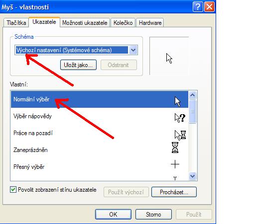 pokud budeme doufat že je to stejné jako v XP pak jsou důležité dvě věci na něž odkazují šipky - především Výchozí nastavení (Systémové schéma).