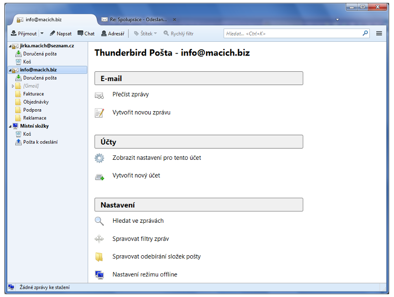Mozilla Thunderbird je e-mailový klient disponující českou lokalizací, který může posloužit jako bezplatná náhrada za MS Outlook ze sady MS Office a vhodně tak doplnit kancelářskou sadu LibreOffice. Je kompatibilní takřka se všemi e-mailovými službami, protože podporuje přístup k poště jak přes starší protokol POP3, tak přes modernější IMAP.