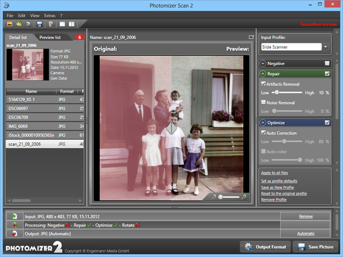 S profesionálním softwarem Photomizer Scan 2 můžete snadno upravovat naskenované fotky, naskenované diapozitivy a dokonce i naskenované negativy. Užijte si více barevné obrázky! Odstraňte chyby a prach zcela automaticky!