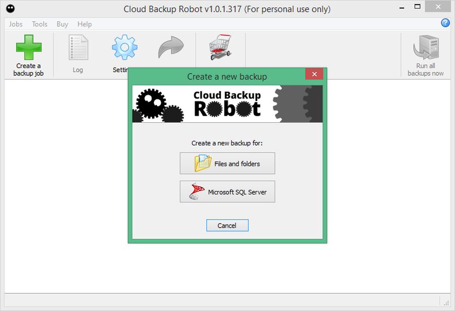 Has it ever occurred to you that losing your important documents, pictures, or music collection could be a major disaster for you? By installing backup software on your computer you can protect yourself from situations like this in the future. Cloud Backup Robot is a very simple, easy-to-use solution for backing up files, folders and MSSQL databases. Cloud Backup Robot archives your data into a .zip file, encrypts it, and sends it to cloud storage (Dropbox, Google Drive, Amazon S3, SkyDrive and Box are supported), a networked folder, or an FTP server.