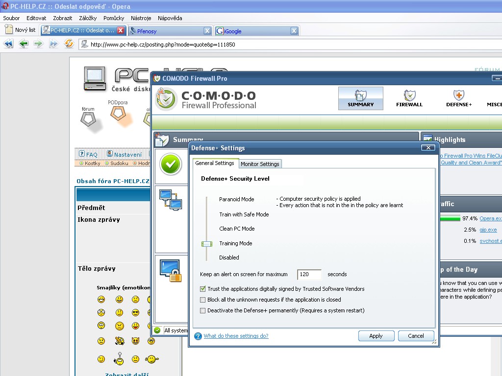 Jde hlavne o nastaveni,ma ruzne urovne "agresivity" ,ja mam nastetsi uz zkusenosti od Jetica,zde je vyhoda nastaveni,doporucuji ten training(ja mam i s safe)+Medium,to ze se uci,nalezi k DEFENSE+,ale zatim moc nechapu k cemu to slouzi,muze to nekdo osvetlit? Jestli to dela ruzne problemy,no hold rozjeli novou verzi to se stava,dejme tomu trochu casu,me dneska napriklad nenaskocil,ze neco nenasel v Documents and Settings,kdyz jsem ho spustil pres ikonu,tak normalne nabehl,ale jinak problemy s netem nemam..zatim a o povoleni uz zada jen vyjimecne,ja osobne davam vetsinu povoleni do trusted zone a ty co nejdou tak allow,obcas vyuziju i update and install.
