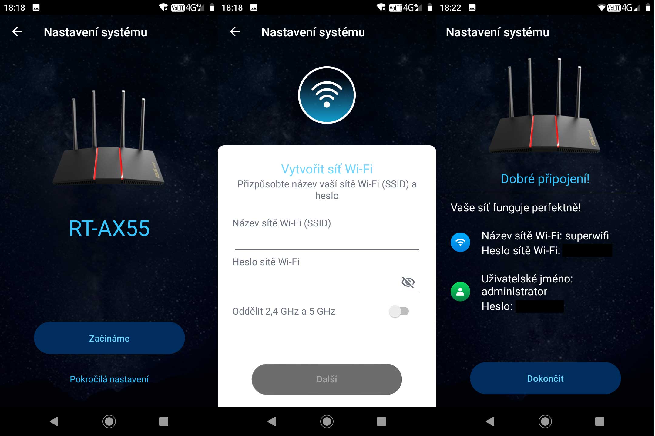Dále nastavíte SSID WiFi a přístupové heslo k WiFi. V dalším kroku si aplikace vyžádá jméno a heslo pro přístup do nastavení routeru.