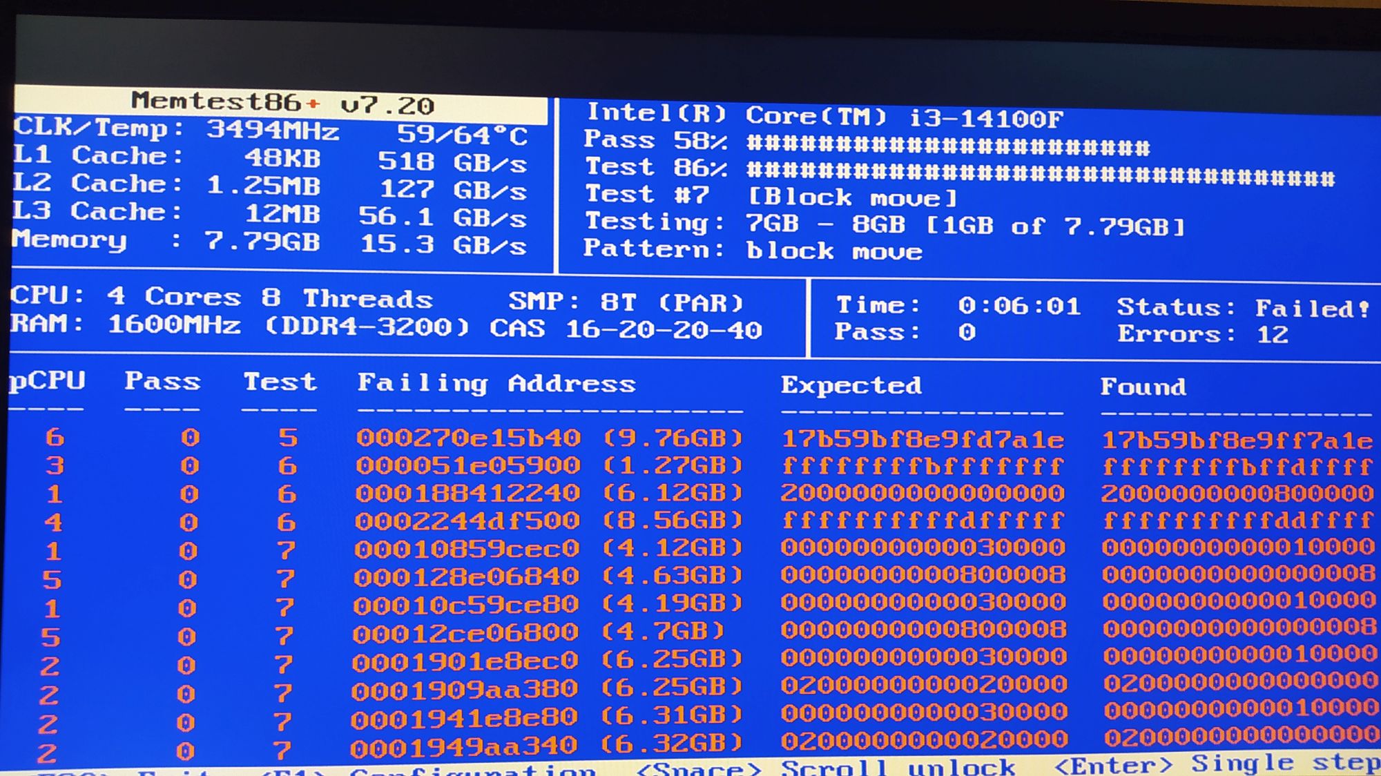 tak jsem to zkusil a po 6 minutách Memtest zamrznul s mnoha chybami - přikládám vyfocenou obrazovku.