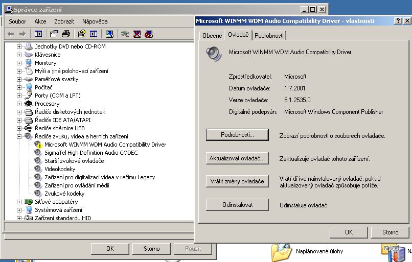 Tak po několikahodinovém snažení, nejen mém - jsem došla k názoru, že problém není s hardwarem, ale se systémem, tedy windows xp. Proč se to co jsem vypnula - tedy WINN WDM Audio Compatibillity driver objevilo mezi hardwarem nevim, ale podle všeho by to mělo součást hardweru ovládajícího zvuk spoušt...