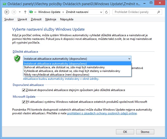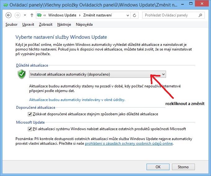 Přejít do ovládacích panelů - windows update - a podle obrázku rozkliknout způsob instalování aktualizací.