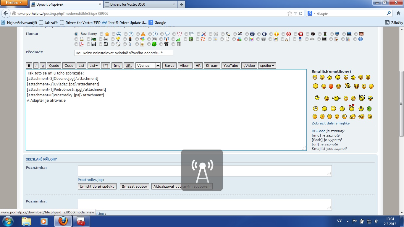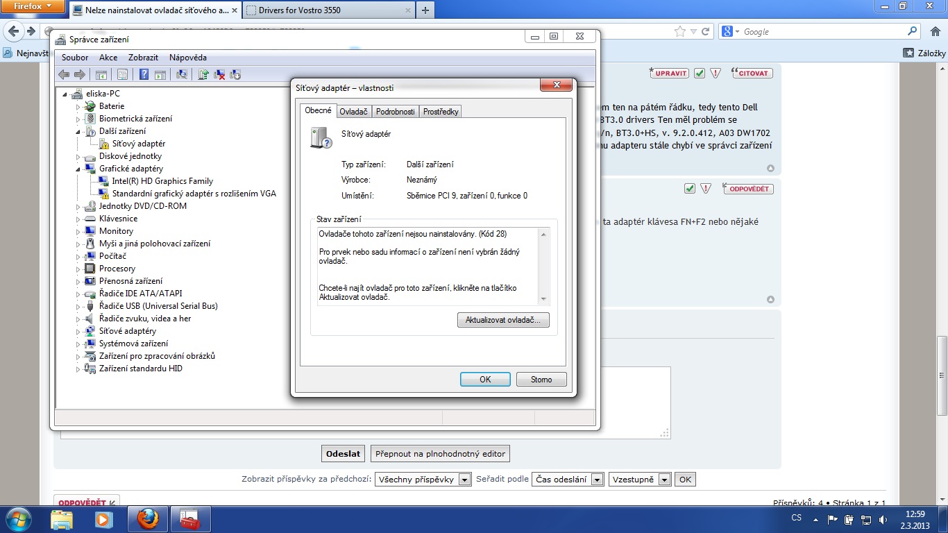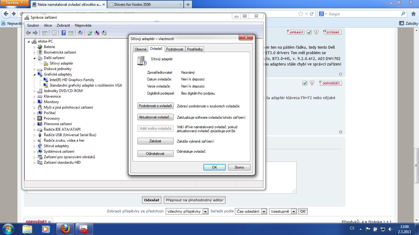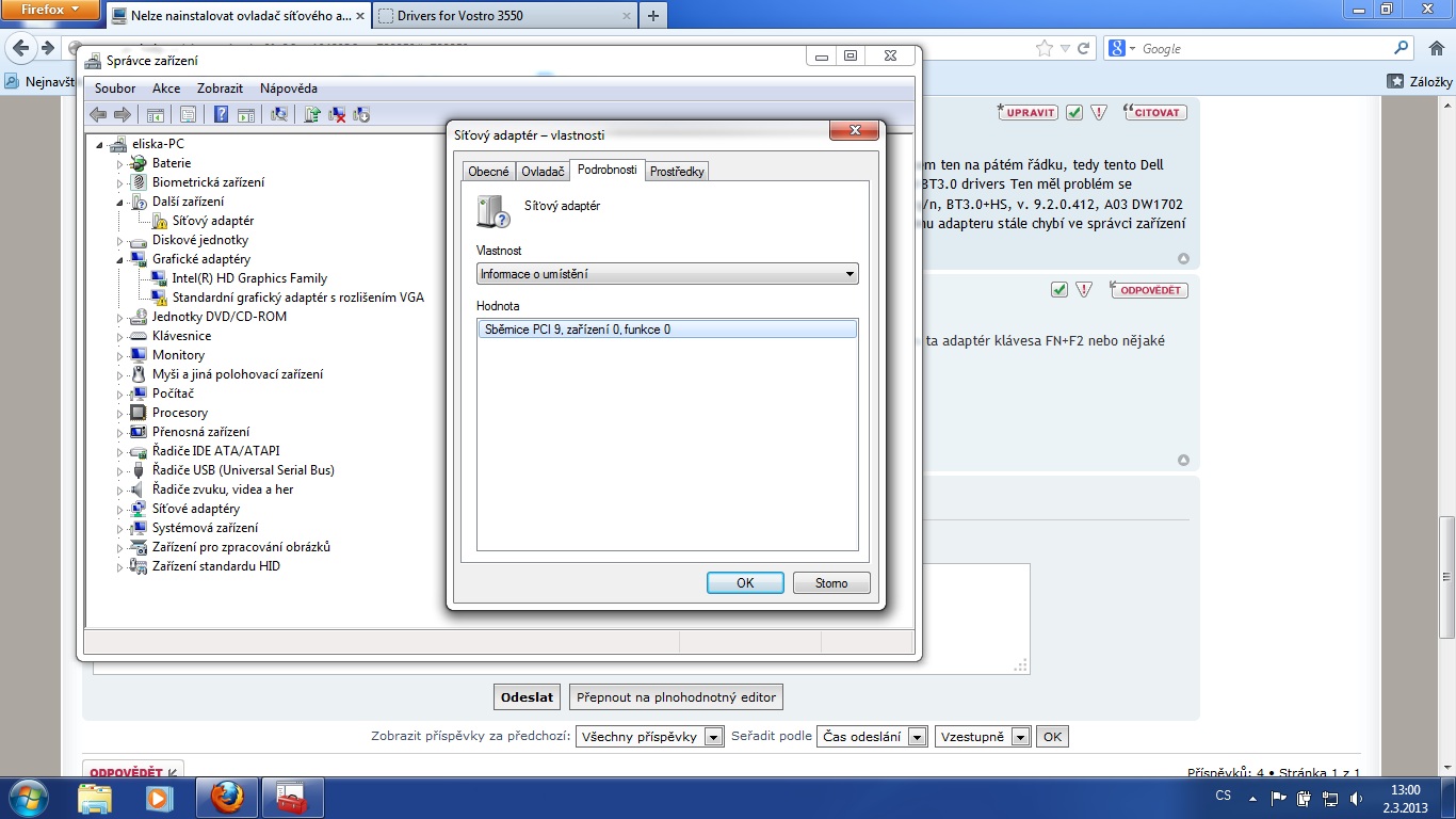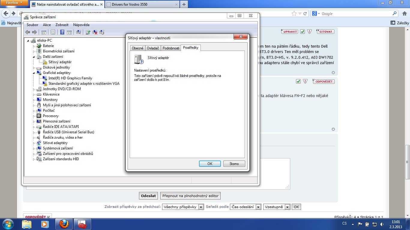 Vikinic: Nebylo možné nainstalovat síťový adaptér. Neboj, už jsem to zkoušela ale projistotu jsem to zkusila znovu teď. Je to stejný :-/ --- Doplnění předchozího příspěvku (02 Bře 2013 13:43) --- adavyp: Ty jsi normálně kouzelník. Už to jde. Jak je to možný? Jak jsi na to přišel? Kde jsi to vzal? Dě...