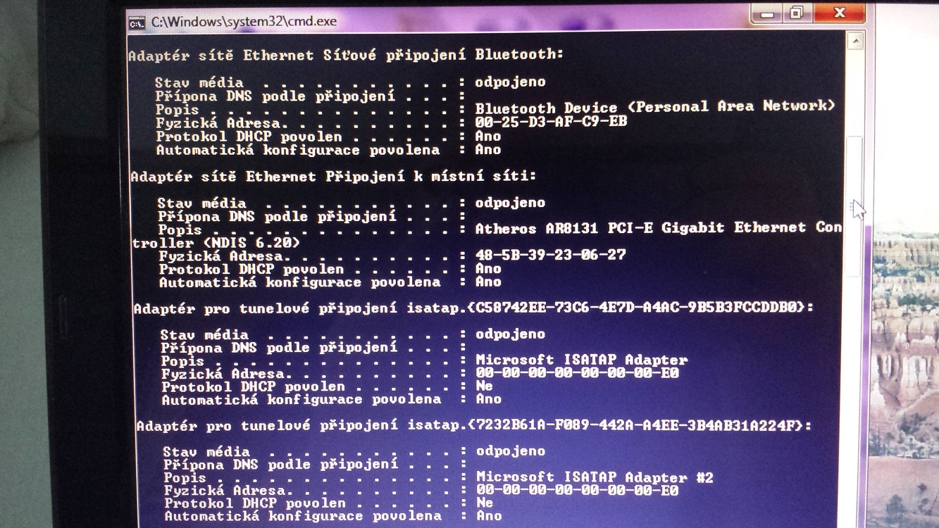 2.u pripojeni kabelem se chova stejne-prikladam screen vypisu ipconfig/all cast Ethernet Pripojeni k mistni siti