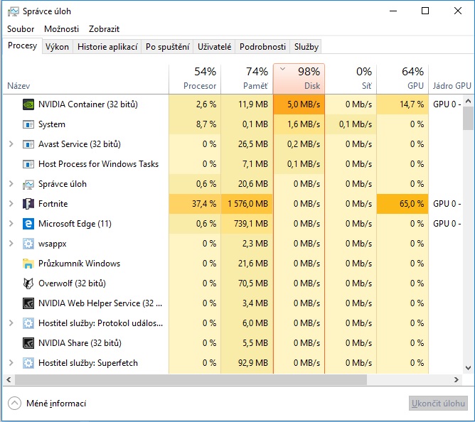 Tak HDD vypadá zatím v pořádku, ale pro změnu mě teď zas ukazuje 100% využití GPU sice je to jen při hraní (Fortnite), ale předtím mi to nedělalo, tak nevím jestli je to tak v pořádku? (btw. mám GTX 960 myslím že je to solidní karta že by neměla být vytížena na 100%)