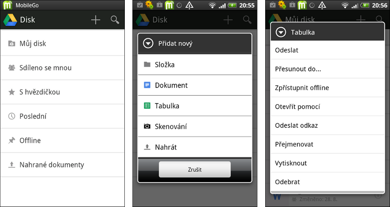 Díky integrovanému textovému editoru a tabulkovému kalkulátoru lze vytvářet nové dokumenty a tabulky, které se automaticky z mobilního zařízení uloží na Google Drive. Samozřejmě lze též ukládat naskenované (ofocené) materiály a nahrávat libovolné soubory z interní paměti zařízení nebo vložené paměťové karty.