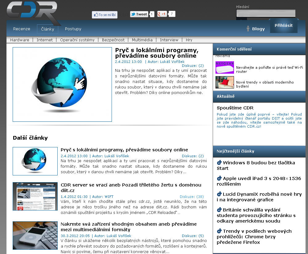 Dobrá zpráva hlavně pro znalce a pamětníky. Servery DIIT.cz a CDR.cz pojedou souběžně, smysl existence obou webů je hezky vysvětlená v diskuzi na CDRku, kde zatímco DIIT bude technickofiremní magazín, CDR se bude držet témat uživatelskospotřebních.