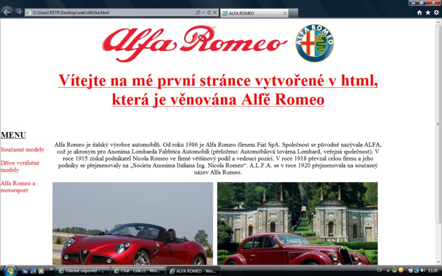 web vcelku vkusný. Jen připomínka : nadpis zkrať na "Vítejte na mých stránkách věnovaným Alfě Romeo". To že to píšeš v html je sice hezké ale jinak je to zbytečná informace. Jednak to nikomu nic neřekne a jednak v čem jiném bys ji chtěl psát ?