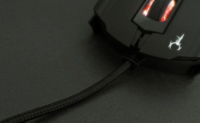 Na konci dvoumetrového kabelu je zlacený konektor s prakticky řešeným plastovým úchopem. Díky němu je zapojení kabelu velmi snadné, takže přenášení myši na herní party nepředstavuje problém. Zároveň je zástrčka tvarována tak, že není třeba zkoumat jak ji natočit pro správné zapojení do portu. I to se hodí pro pravidelné odpojování a připojování, když si chcete na herní party vzít vlastní myš Kabel je opatřen suchým zipem, s jehož pomocí jej lze rychle zatočit do skladného klubíčka.