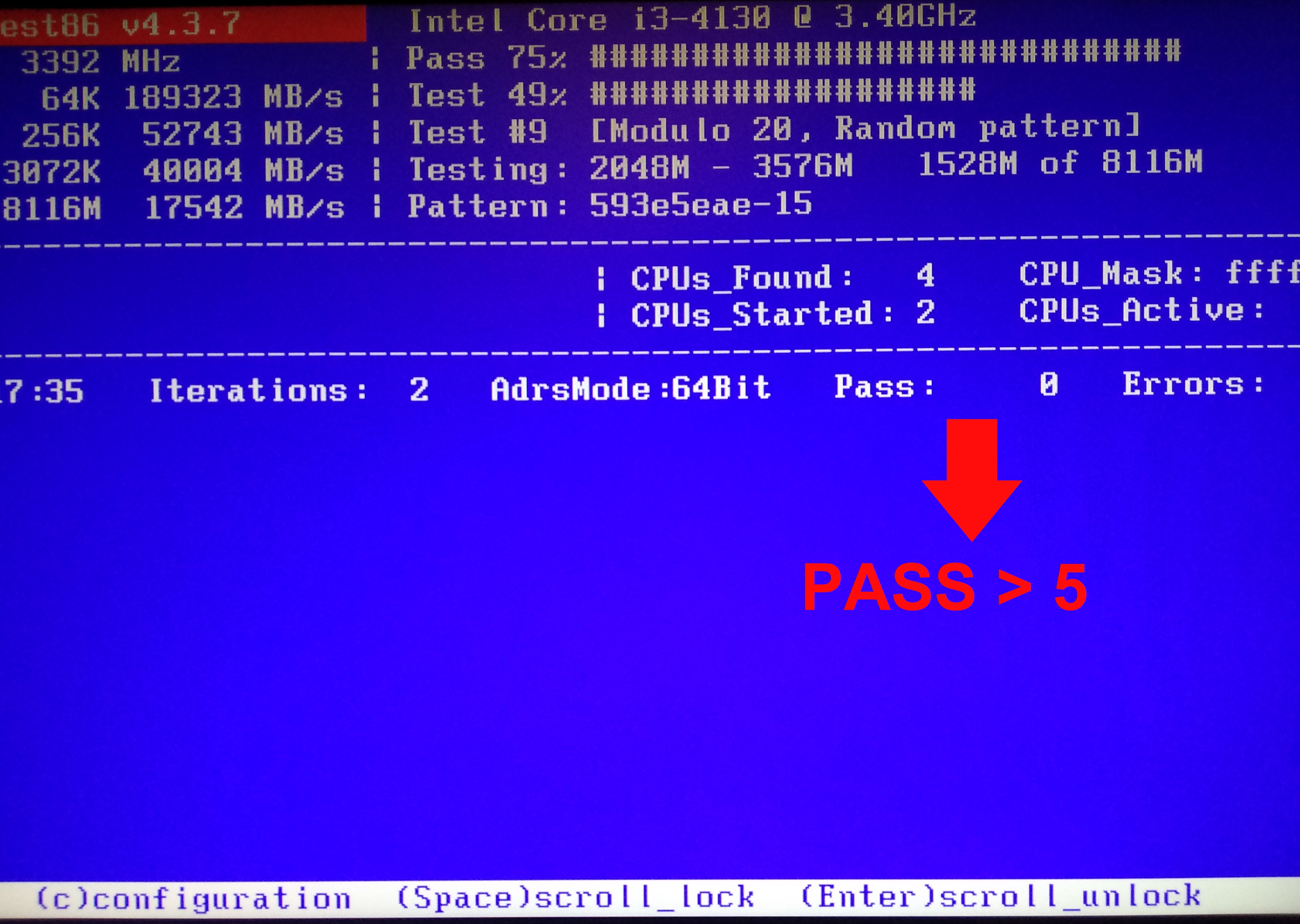 Z vytvořeného bootovatelného CD či flash disku nabootujeme a spustíme test paměti. Memtest86 by měl několikrát otestovat celý rozsah paměti (hodnota parametru PASS > 5).