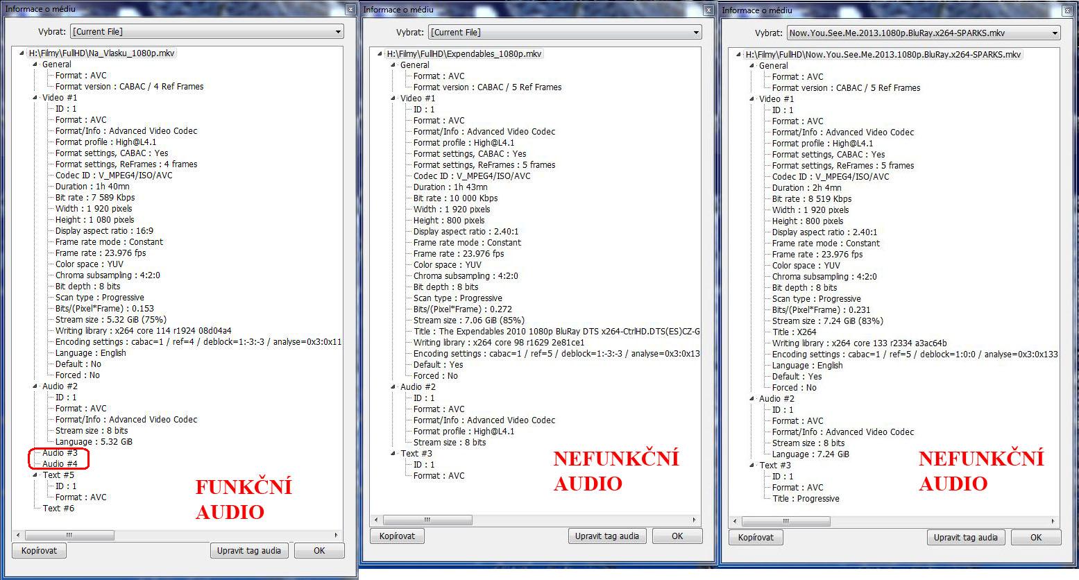 Vyzkoušel jsem postupně 3 různé filmy a u Na Vlásku (vlevo na obr.) audio funguje, u filmů Expendables a Podfukaři (uprostřed a vpravo) už ale ne.