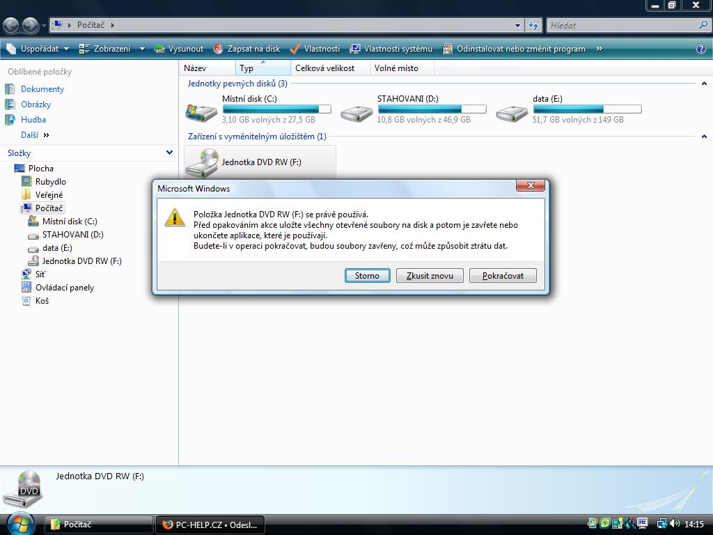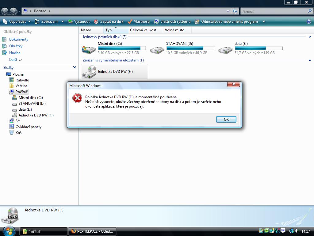 Dobrý den , vypalovačka nejde vůbec vysunout celé dopoledne jsem přemýšlel čím by to mohlo být.ve správci zařízení ukazuje , že je vše ok.nainstaloval jsem nejnovější firmware .nic nepomáhá.zkoušel jsem odinstalovat a zase nainstalovat a zase nic.ona jakoby bliká , že se chce otevřít ale nic když ji chci vysunout z winu tak mi to napíše