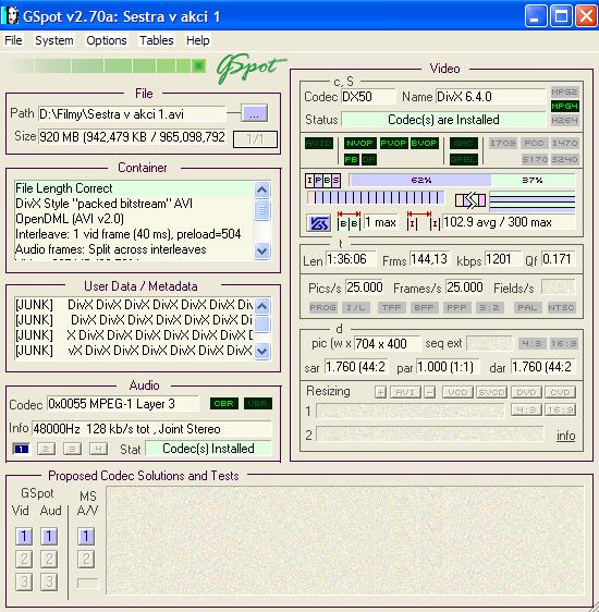 Pro zjištění Audio, Video codeků a mnoho dalšího o filmu, anebo music dobře poslouží jednoduchý GSpot