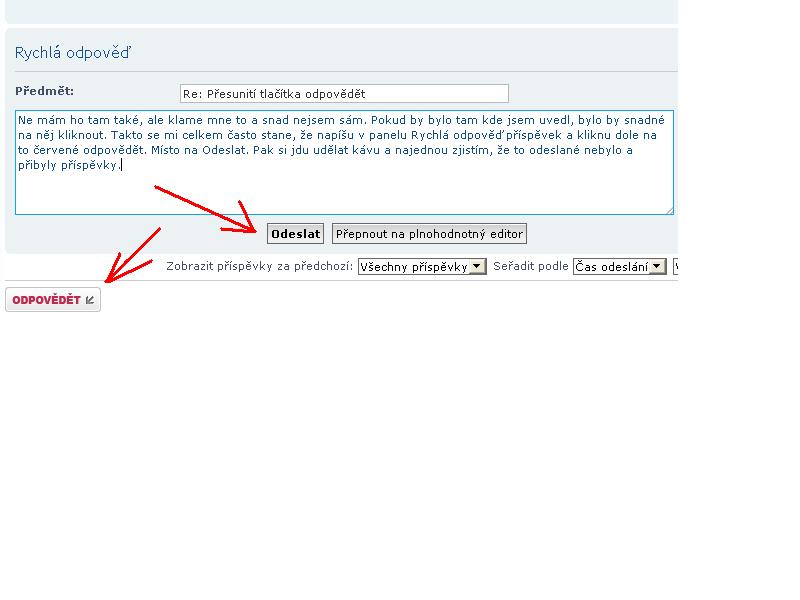 Ne mám ho tam také, ale klame mne to a snad nejsem sám. Pokud by bylo tam kde jsem uvedl, bylo by snadné na něj kliknout. Takto se mi celkem často stane, že napíšu v panelu Rychlá odpověď příspěvek a kliknu dole na to červené odpovědět. Místo na Odeslat. Pak si jdu udělat kávu a najednou zjistím, že to odeslané nebylo a přibyly příspěvky.