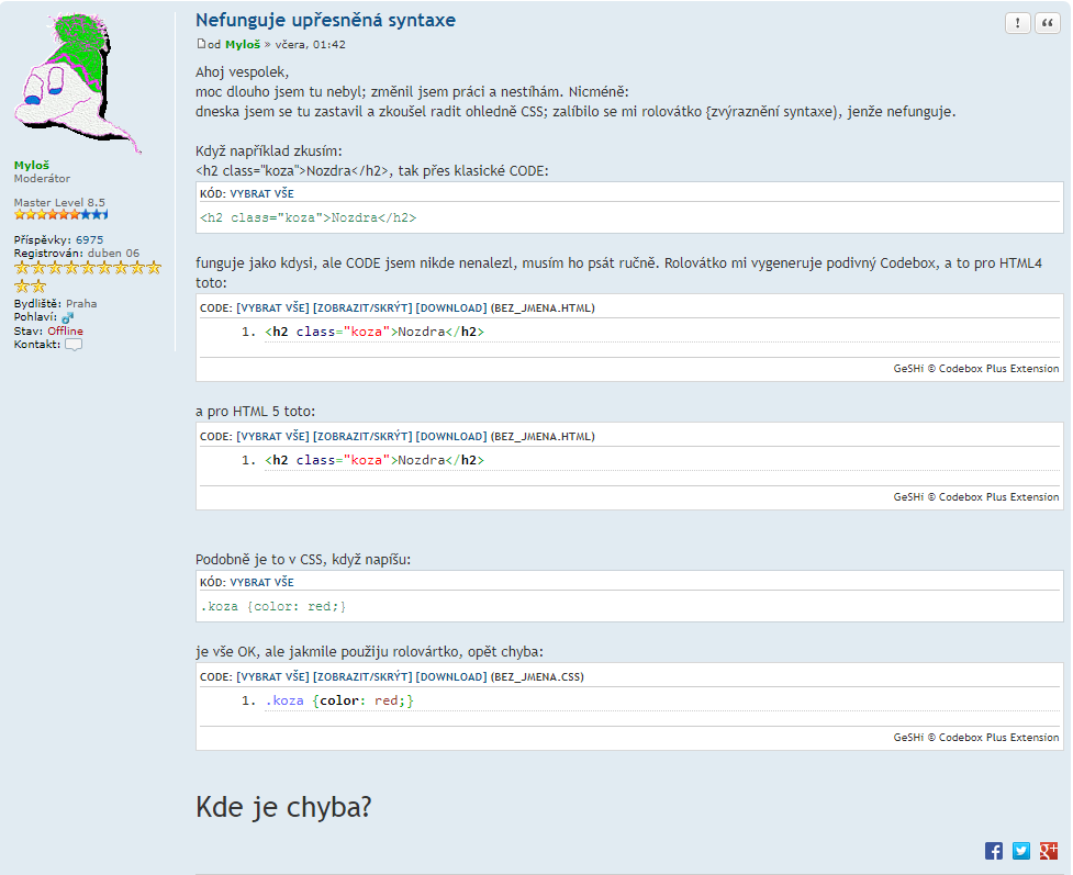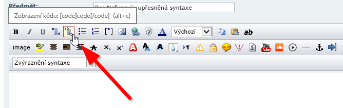 funguje jako kdysi, ale CODE jsem nikde nenalezl, musím ho psát ručně. Rolovátko mi vygeneruje podivný Codebox, a to pro HTML4 toto: