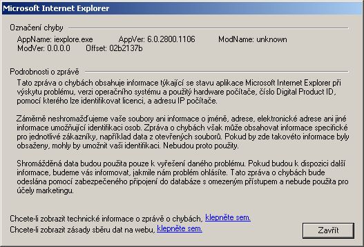 zdravim.Pod WIN2000Prof mi zacal IE 6 po zavreni stranky hlasit problem a restartuje explorer.Nevite nekdo,jak to pokusit opravit?v priloze je ona chyba...DIky