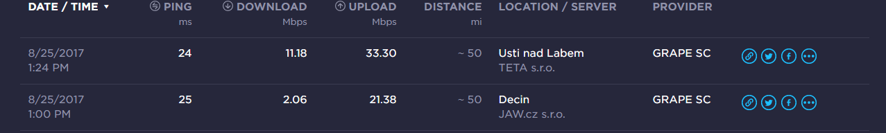 Ahoj, už nějakou dobu jsem měl problém s rychlostí připojení a stabilitou připojení k mému ntb. Mám poskytovatele Grape as. a údajně by měl jít internet až 200 Mb/s, většinou jsem doma jenom já a jeden z rodičů, ti ale moc na internet nechodí, maximálně kouknou na emai. Nemám ani nějaký šunt router, mám https://www.alza.cz/tp-link-tl-wr1043nd ... toChange=1 . Hraju dost hry a dost to vadí.. většinou to není malé zvýšení pingu, ale rovnou se mi zvýší na pár tisíc, většinou rychle zkusím spustit internet, jestli to není serverem, ale nejde ani načíst seznam. Speedtest: http://beta.speedtest.net/result/6568590447